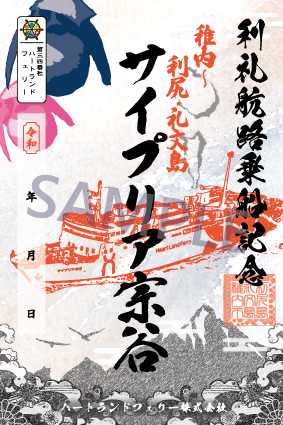 背景には各船と波模様、利尻島・礼文島の観光名所である利尻富士や猫岩・桃岩が描かれています。