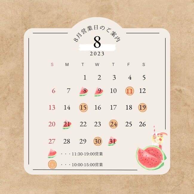 8月の営業日時: 8/8(火)・8/9(水) 11:30〜19:00、