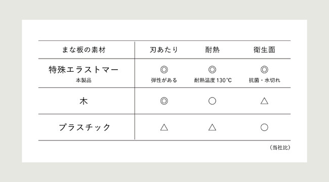 傷がつきにくい弾力性 弾力性のあるエラストマーは木やプラスチックのまな板に比べて包丁の刃の厚みによるV字状の傷がはいりにくく、食品カスが詰まりにくいため、衛生的にご使用いただけます。