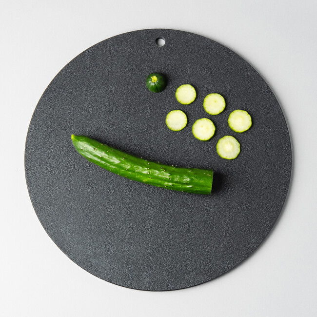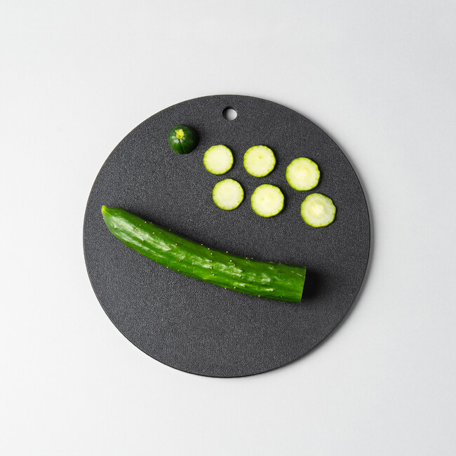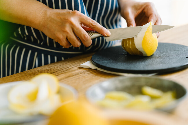 木の質感のようなやわらかい刃あたりと約8mmのほどよい厚さと軽さで使い勝手がよく、また特殊な表面のシボ加工や素材のため、まな板自体がすべりにくくなっています。