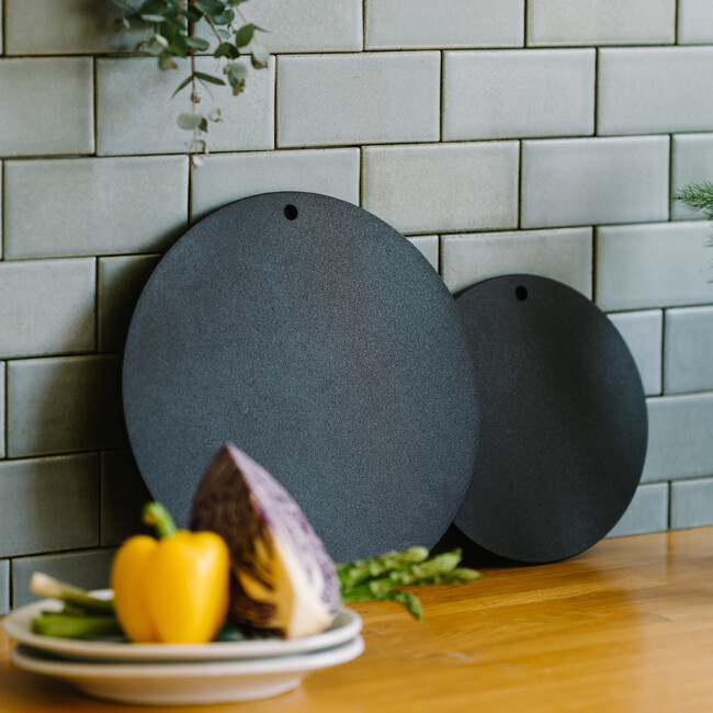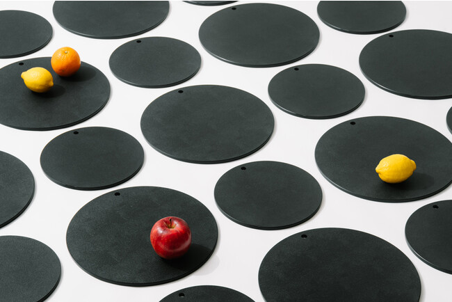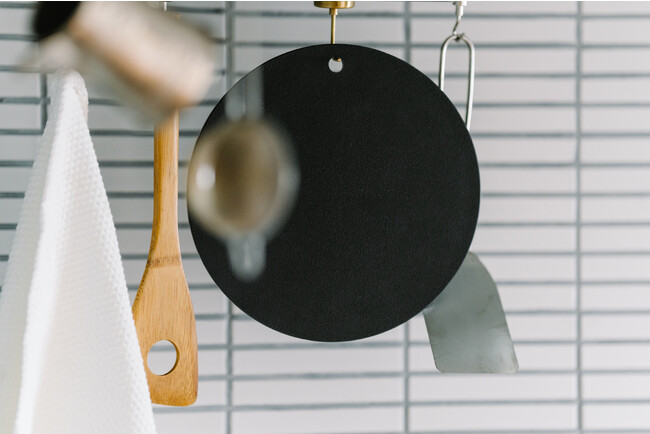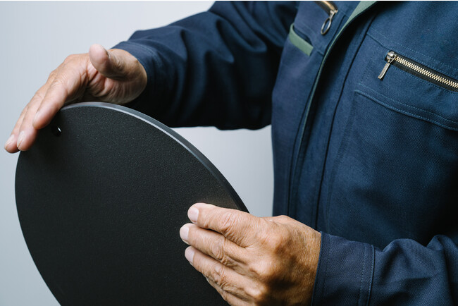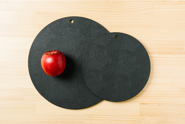 開発時から何度も試作を重ね、傷が目立たないチャコールグレー、円形であること、吊り下げ穴があること、たわまない8mmの厚みにこだわって開発。