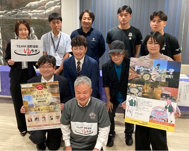 記者会見には日本温泉科学会第 76 回大会委員長 名古屋市立大学教授鏡 裕行氏、 TEAM湯野温泉「いいゆラボ」理事 西田宏次朗をはじめとする主要メンバー、周南市地域振興部観光交流課、周南公立大学経済学部の学生が参加し、今後の意気込みを語りました。