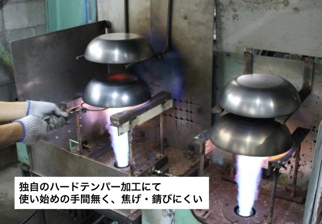 「一流シェフの認める鉄フライパン」は、出荷前に独自技術の”ハードテンパー加工”を行い、この面倒な手間から皆さんを開放、最初から油が馴染み、焦げ・錆びにくい状態ですぐにお使い頂けます。