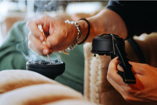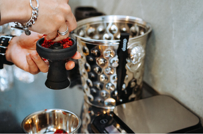 シーシャ台の上に、「フレーバー」と呼ばれる、たばこの葉を乗せて、炭で熱することで出る煙を、水に潜らせて吸うことを指します。