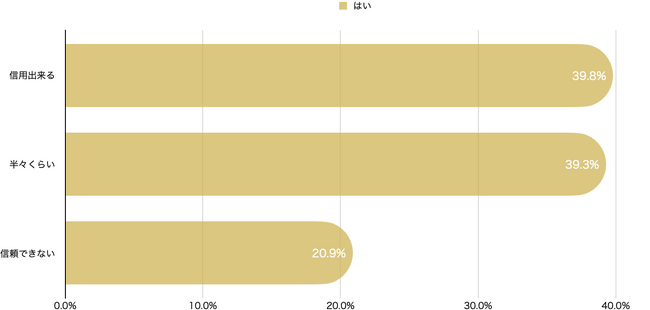 「下記のオンラインメディア(※)で提供される情報をどの程度信頼していますか」の質問に対し、「信頼出来る」「半々くらい」の回答を合わせると全体の79.1%、「信頼出来ない」が20.9%となっており、大多数の利用者が情報源として一定の信頼を持って利用していることが分かりました。