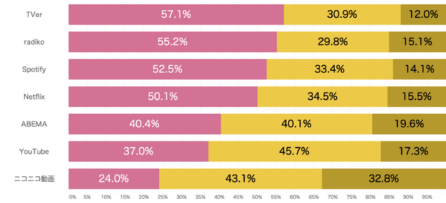 信頼度の高い順に「TVer」(57.1%)、「radiko」(55.2%)が挙げられ、民放系メディアへの信頼性が高い傾向にありました。「YouTube」に代表されるユーザー投稿型メディアに比べるとコンテンツ数は少ないものの、情報の信憑性がある程度担保されている高品質なコンテンツが多い傾向にあり、このような側面も評価されている可能性があると推測します。