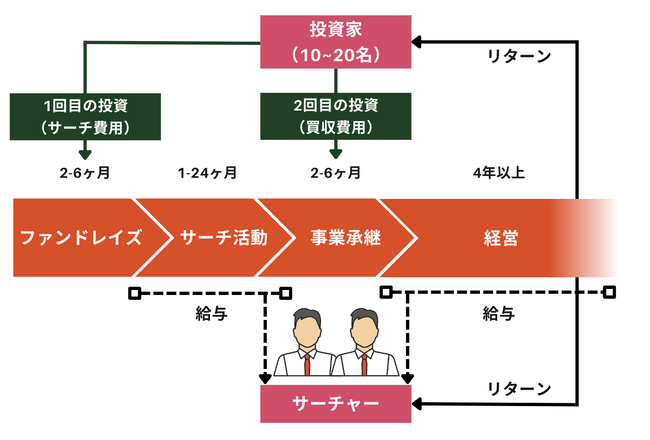 トラディショナル型サーチファンドとは経営者候補(サーチャー)が複数の投資家から資金を調達し、サーチファンドを組成、自らが事業を承継する1社の株式を譲り受け、その後中〜長期的な企業価値の向上に努める仕組みです。サーチファンドのビジネスモデルは、1984年に米スタンフォード大にて考案され、その後米国から世界各国に広がりました。ビジネススクール(MBA)の卒業生を中心に、これまでに全世界で700件以上のトラディショナル型サーチファンドが立ち上げられてきました。国内ではこれまで2件のトラディショナル型サーチファンドが組成されて来ましたが、当社はこれらに次ぐ3件目の組成(パートナー型としては初)となります。