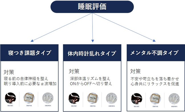 良質な睡眠を得るための、MUSIC(聴覚)/DRINK(味覚)/AROMA(嗅覚)の睡眠三感を提供するサービス。 SleepLIVE(株)開発の睡眠評価法を用いて、睡眠課題を3つに分類。それぞれの方へ適切な寝る前の過ごし方をご提案します。