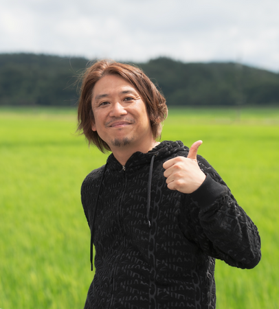 (写真:ふるさと秋田の水田の前に立つ、株式会社エスツー代表 須藤晃平)