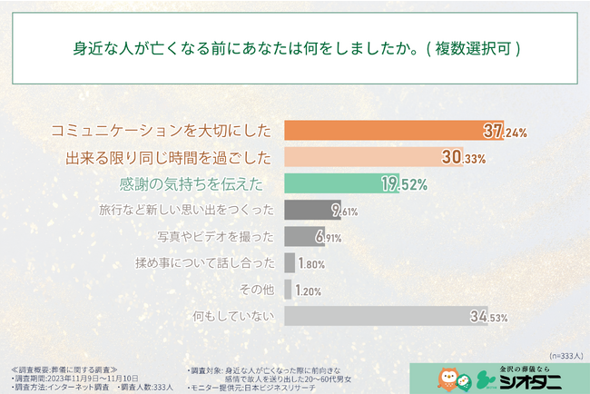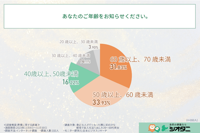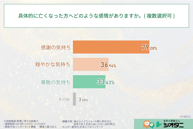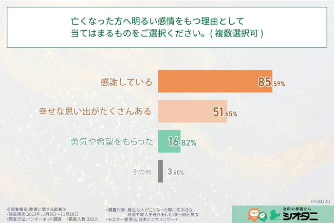 シオタニ株式会社(本社:石川県金沢市、代表取締役:塩谷 真一郎)は、この度、身近な人が亡くなった際に前向きな感情で故人を送り出した経験を持つ20代から60代の男女333人を対象に、故人への感情や葬儀等に関する意識調査を実施いたしましたので、お知らせいたします。