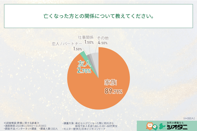 まず、今回調査した「身近な人が亡くなった際に前向きな感情で故人を送り出した20〜60代の男女333名」の方々に、「身近な人」との関係性を答えてもらいました。