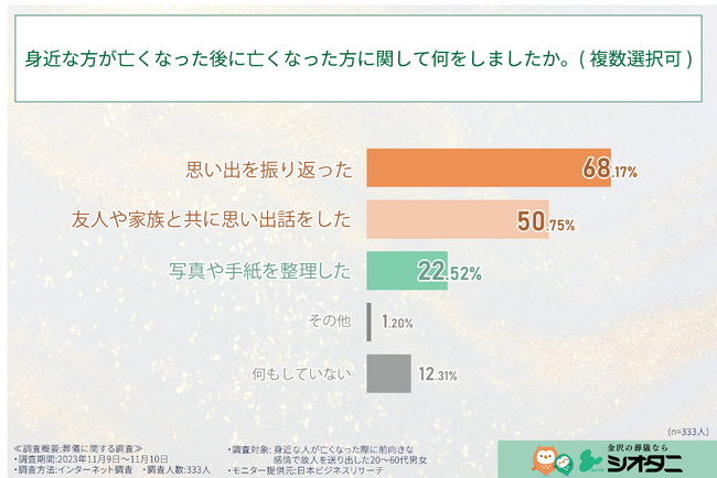 自分の中で思い出を振り返ったり、友人や家族と思い出話をしたりして、故人に思いを馳せる方が非常に多いということが分かりました。