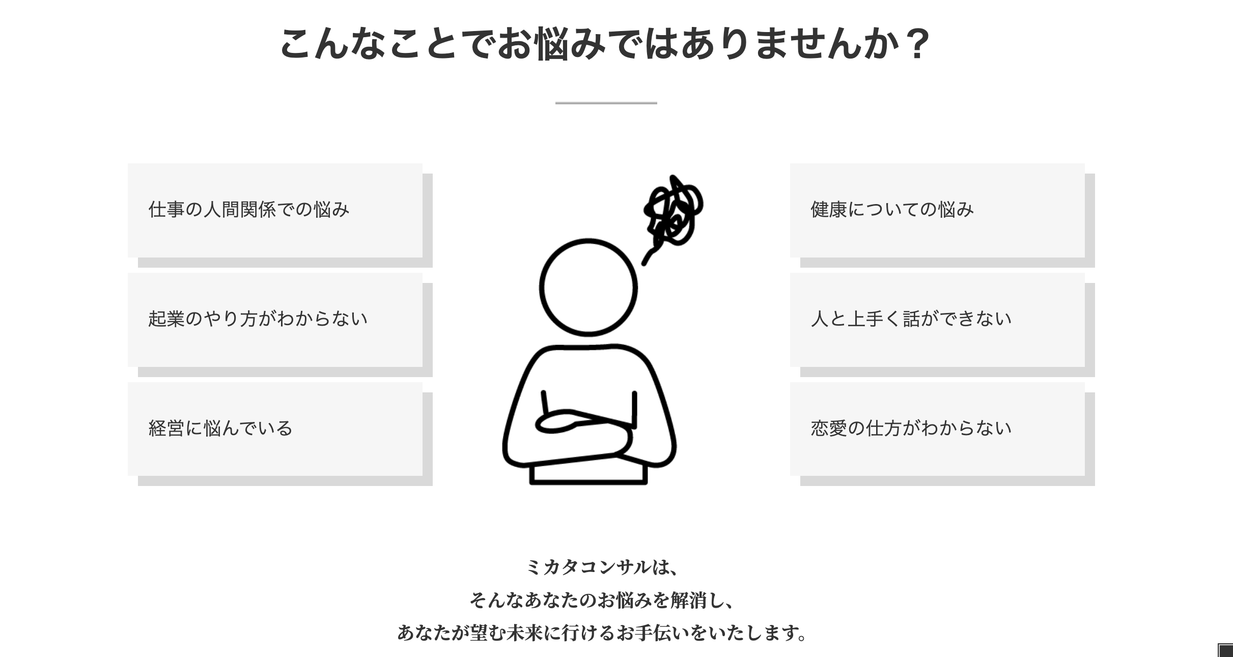 ミカタコンサルでは「経営・起業について」「仕事・職場・キャリアでの悩み」「恋活・婚活・結婚について」「対人関係の悩み」など皆様の「味方」になれるようビジネス以外の相談も多岐に渡り受け付けております。