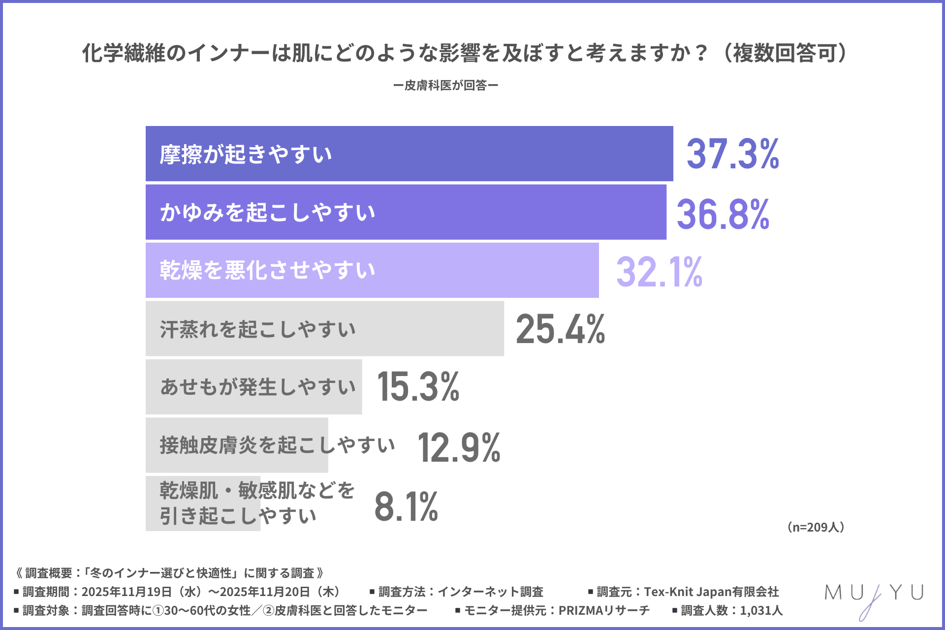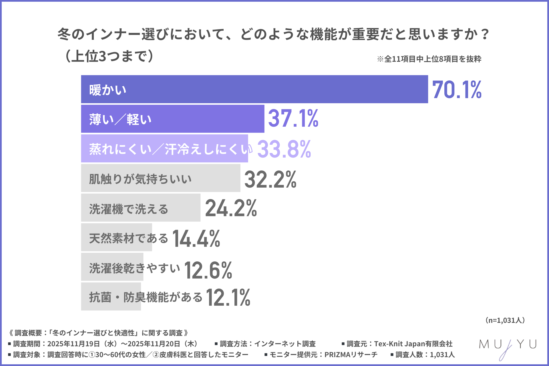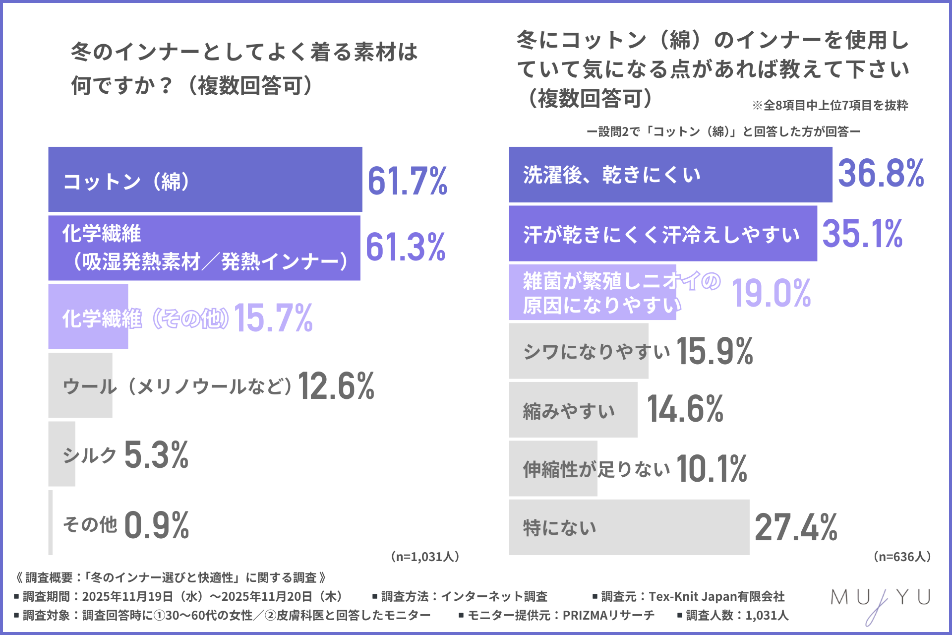 そこで今回、素材にこだわったインナーブランド『MUjYU』を展開するTex-Knit Japan有限会社(https://mujyu.jp/)は、1.30〜60代の女性/2.皮膚科医を対象に「冬のインナー選びと快適性」に関する調査を行いました。