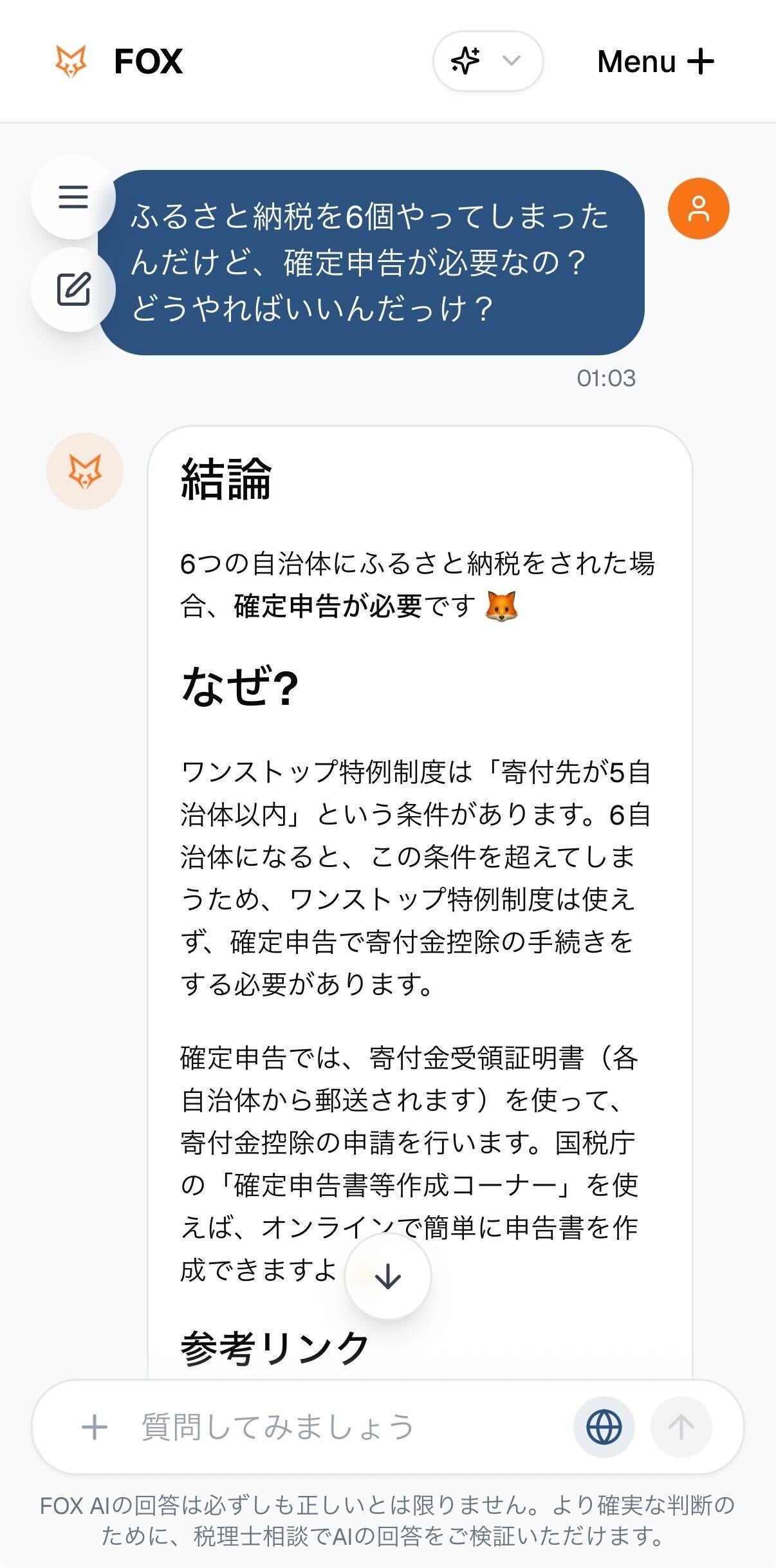 - AIが法令や国税庁などの信頼できるサイトを横断的に確認し回答します。