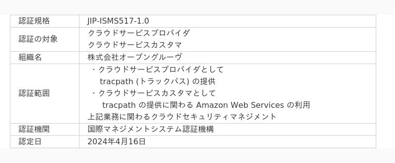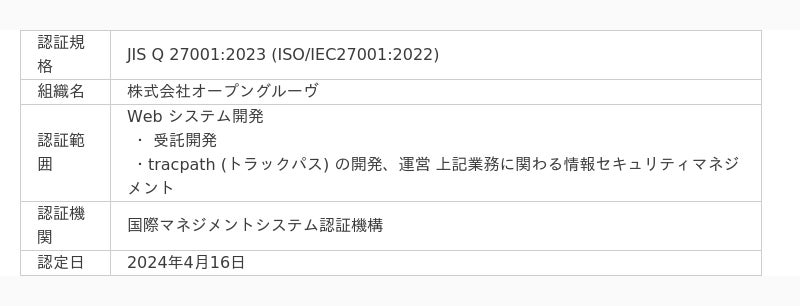 株式会社オープングルーヴは、ISMSが適正かつ健全に機能しているとの評価を受け、2024年4月16日にISMS(Information Security Management System)の国際規格であるISO/IEC27001及びクラウドセキュリティISO/IEC 27017の認証を取得しました。