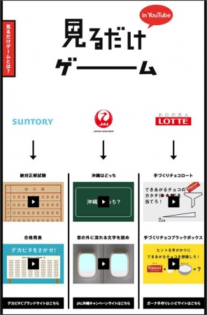 動画広告コンテンツ「見るだけゲーム in YouTube」本日より公開! プロジェクトにはサントリー、JAL、ロッテの3社が参加 http://www.mirudakegame.com