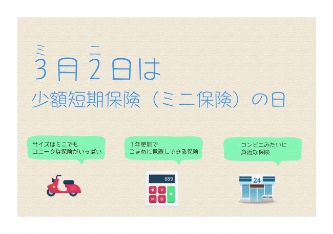 一般社団法人日本少額短期保険協会 (東京都中央区八丁堀 会長:杉本尚士)は本年より、3月2日を一般社団法人日本記念日協会認定の「少額短期保険(ミニ保険)の日」と制定しました。制定に伴い各種PRイベントを開催いたします。