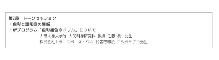 次いで、ホームインステッド事業でも今年10月に導入しお客様にご好評いただいている「色彩組色(R)ドリル」を佐藤教授と共に開発された株式会社カラースペース・ワム 代表取締役 ヨシタ ミチコ先生にもご登壇いただき、色彩が認知症ケアに与える可能性についてトークショー形式でご紹介いたしました。認知症高齢者のQOL(生活の質)向上に有効なオリジナルプログラムCUS(R)色彩理論に基づく『色彩組色(R)ドリル』の開発経緯や今後の更なる可能性についてご理解いただき、盛会裡に終了いたしました。