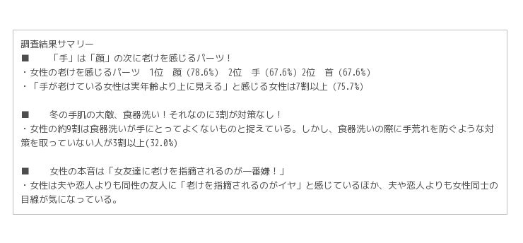 ※2 『老け』とは、”しみ” ”しわ” ”くすみ” などで手に老化が現れた状態の事。