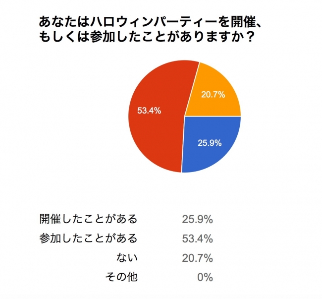 上記の質問に対し、回答者の約26%が、ハロウィンパーティーを開催、約53%が参加したことがあると回答。合計で約79%の方が、ハロウィンパーティー を楽しんでいるという結果となりました。日本でもハロウィンを楽しもうという傾向が定着し、家族や友人とのホームパーティーを開催するという家庭も増えて きています。