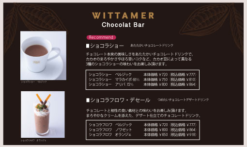 チョコレートドリンクは、チョコレート本来の香りと味わいを楽しめる「ショコラショー」(あたたかいチョコレートドリンク)、デザート感覚で楽しめる「ショコラフロワ・デセール」(つめたいチョコレートデザートドリンク)が、それぞれ3 種類。