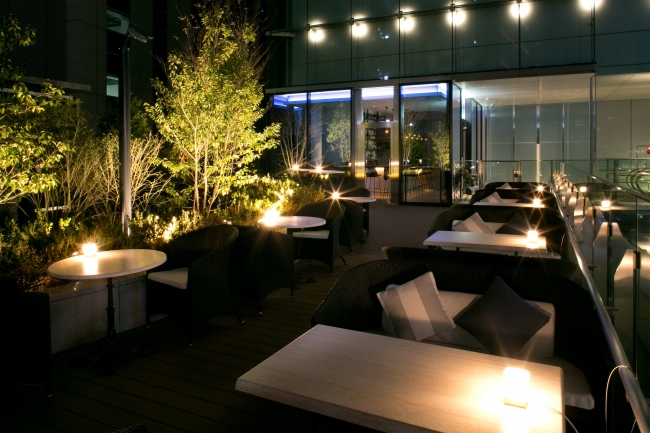 「サラベス東京店」のルーフトップテラスからは?重洲桜通りの169 本の桜並?を?下ろせ、東京駅の側にいるとは思えない開放的な雰囲気です。夜は、東京の喧騒から少し離れた落ち着いた空間を演出します。