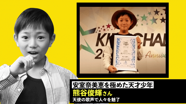 天才歌うまキッズ、熊谷俊輝くん(10才)。過去に出演したTV番組では、“天使の美声”と評される。アムロスに陥っている日本社会に向け、大人顔負けの歌声を是非お楽しみください。