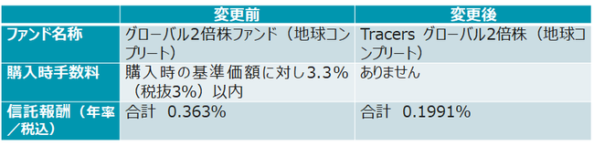 追加型投信「Tracers グローバル2倍株(地球コンプリート)」は、2021年12月に設定した追加型投信「グローバル2倍株ファンド(地球コンプリート)」を8月31日付で約款変更し、Tracersシリーズへ追加いたしたものです。これに伴い、信託報酬率を0.3993%から0.1991%(いずれも税込)に引き下げ、ノーロードとしました。8月31日現在、株式会社SBI証券、auカブコム証券株式会社、PayPay銀行株式会社、松井証券株式会社、マネックス証券株式会社、楽天証券株式会社でご購入いただけます。