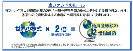当ファンドの運用方針には変更はありません。当ファンドは、「先物を活用し、純資産総額の2倍相当額を世界各国の株式に幅広く分散して投資する」ルールをトレースします。当ファンドは、ETF(上場投資信託証券)や株価指数先物取引を積極的に活用し、主として日本を含む世界各国(新興国を含む)の株式に実質的に投資します。投資対象国・地域については、特定の国・地域の株式に限定するのではなく、市場規模や流動性、取引規制などの投資環境を考慮して、日興アセットが投資可能と判断した世界各国の