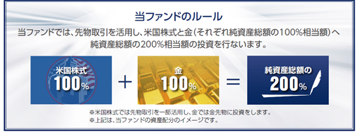 当ファンドでは、「先物取引を活用し、米国株式と金(それぞれ純資産総額の100%相当額)へ純資産総額の200%相当額の投資を行なう」というルールをトレースします。