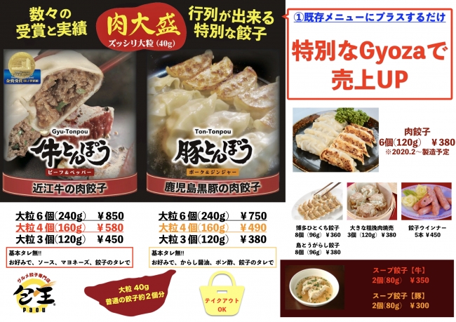 既存メニューにプラスするだけ!特別な餃子で既存外食店の集客UP売上UPに貢献します。