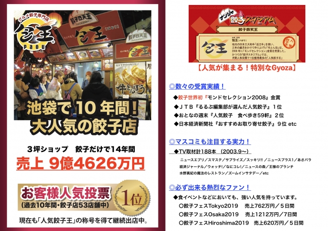 株式会社アップラインズ(本社:滋賀県彦根市、代表取締役:滝川徹)は、2003年より運営する肉餃子専門店「包王(ぱおう)」の看板メニューで、16年間、数々の受賞と実績を積み重ねた人気餃子2種の取扱店を、各都道府県1店限定、計47店舗を12月1日から優待募集(諸費用無料)します。