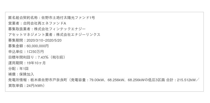 【佐野市土地付太陽光ファンド1号 募集概要】