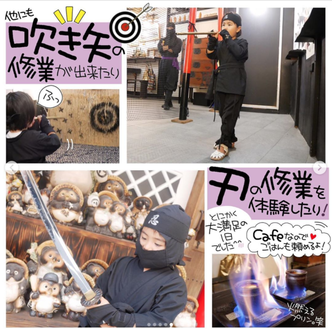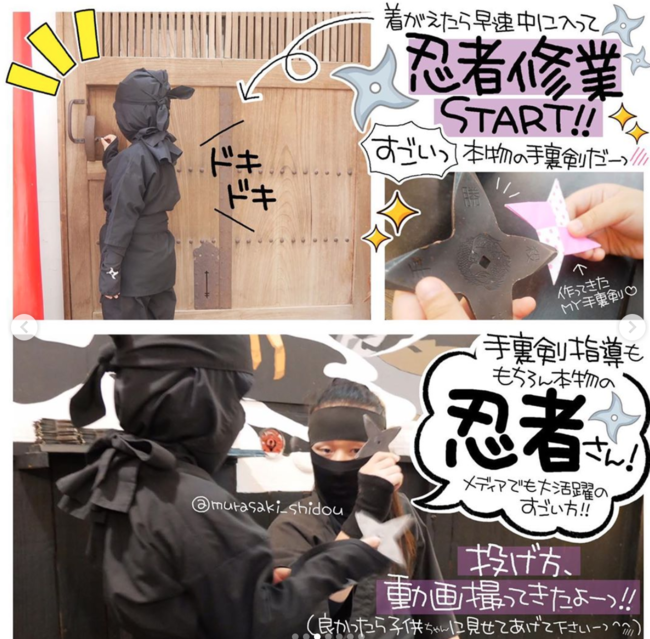 来客自らが「忍者」になることを最大のストロングポイントとしており、忍者衣装を身をつけて手裏剣や吹き矢、刀の居合いなどの忍者修行を実際に体験することが可能です。