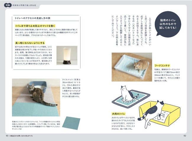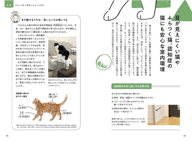 一方、猫が老化や重い病気で十分に体を動かせなくなってきてからのケアの情報や介護サービスの普及が追いついていない課題があります。とくに猫は、見慣れぬ人や環境を苦手としやすい気質から、他者へお世話を頼りにくい動物。動物病院で検査や治療を受けさせながらも、自宅では「食べてくれない」「投薬や看護的なケアに抵抗する」姿を前に心をすり減らし、何とかできないかと手探りで対応する方々の悩みがインターネット上にも散見されます。そこで本書は、猫の介護の実践的な方法や、介護期の猫との向き合い方を丁寧にまとめ、飼い主さんをサポートします。
