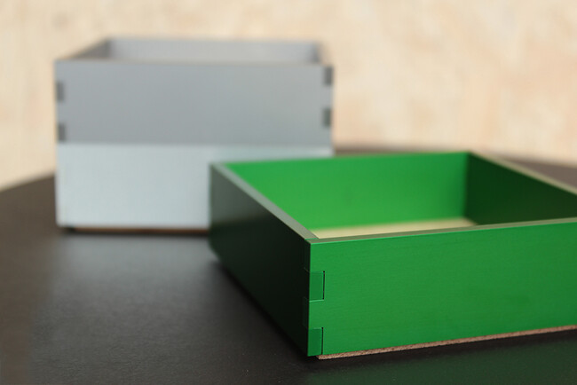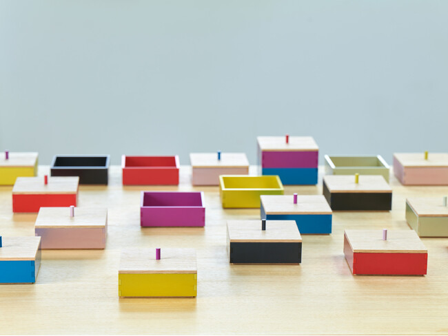 吊り箇所がわからないよう工夫を凝らした着色アルマイト処理によるカラフルな側板を、木製の底板をはめ込みながら「あられ組」で接合させて「ミ」が仕立てられます。「フタ」のつまみには工業製品でしばしば見られるローレット加工が施されていますが、不思議と工芸的な印象を漂わせています。とても斬新な指物の升ですが、底板やフタに使用されている木材(ナラ)が伝統的な指物の温かみを受け継いでおり、インテリアとしての親和性が高いのも特徴です。