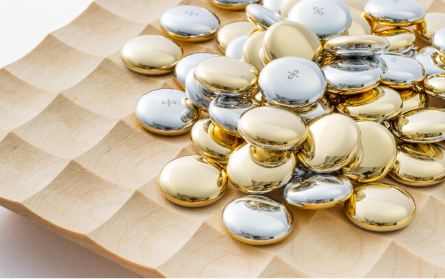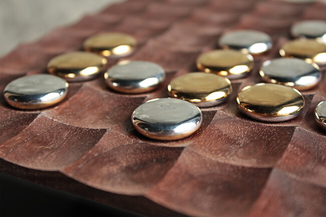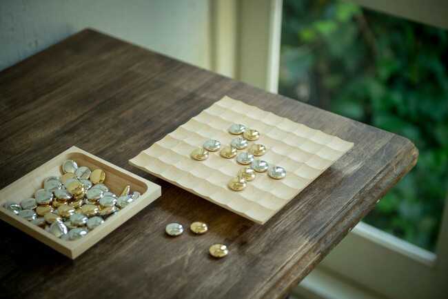 製品概要:彫刻的な盤上で継ぎ目の無い二種の金属がきらめく、豊かな時間が流れるリバーシゲームです。