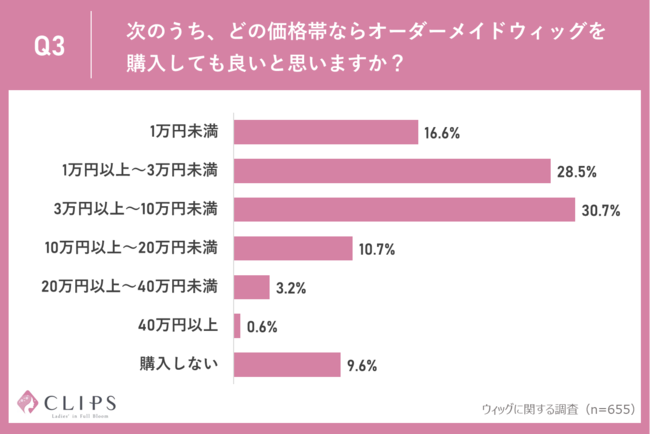 Q3「次のうち、どの価格帯ならオーダーメイドウィッグを購入しても良いと思いますか?」(n=655)の質問に対し、「3万円以上10万円未満」が最も多く30.7%、次いで「1万円以上3万円未満」が28.5%、3番目に「1万円未満」が16.6%ととなり、実際に購入しても良いと思う価格は1万円〜10万円未満の低価格帯に75%以上が集中する結果となりました。