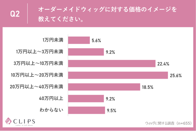 Q2「オーダーメイドウィッグに対する価格のイメージを教えてください。」(n=655)の質問に対し、「10万円以上20万円未満」が最も多く25.6%、次いで「3万円以上10万円未満」が22.4%、3番目に「20万円以上40万円未満」が18.5%と、オーダーメイドウィッグの価格に対して高額なイメージを持っている人が多いという結果になりました。