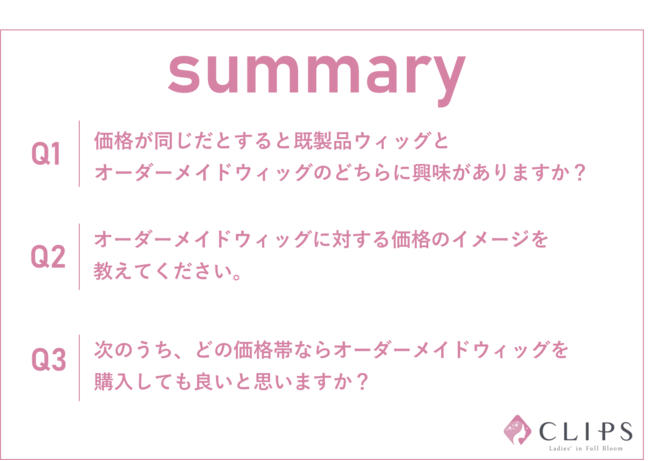 Q2のオーダーメイドウィッグの価格に対するイメージの金額と比べると、より低い価格に回答が集中しており、オーダーメイドウィッグをもう少しお手頃な価格で購入したい人が多いということが推測されます。