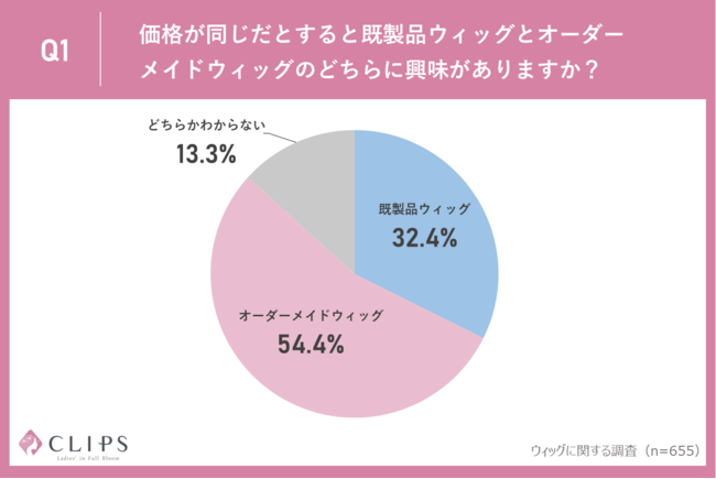 Q1「価格が同じだとすると既製品ウィッグとオーダーメイドウィッグのどちらに興味がありますか?」(n=655)の質問に対し、「既製品ウィッグ」と回答した人が32.4%、「オーダーメイドウィッグ」と回答した人が54.4%と、過半数がオーダーメイドウィッグに興味があるという結果になりました。