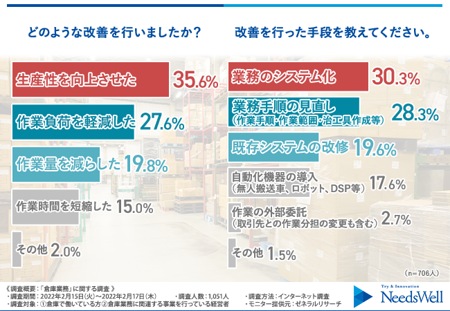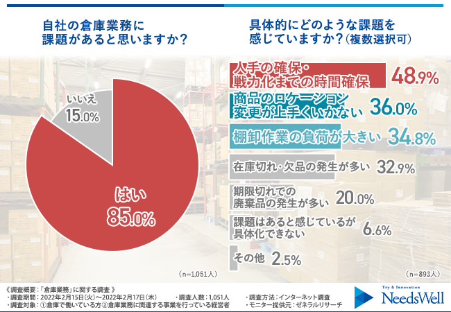 今回、倉庫管理システム『SmartWMS』(https://www.needswell.com/solution/smartwms)を販売する株式会社ニーズウェルは、1.倉庫で働いている方2.倉庫業務に関連する事業を行っている経営者の方を対象に、「倉庫業務」に関する調査を実施しました。