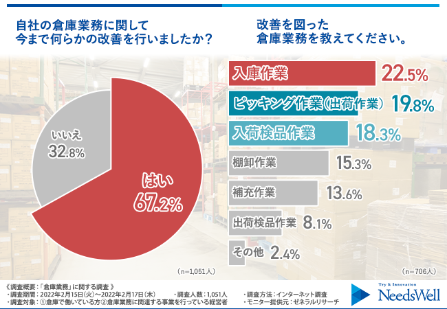 「自社の倉庫業務に関して今まで何らかの改善を行いましたか?」と質問したところ、6割以上の方が『はい(67.2%)』と回答しました。