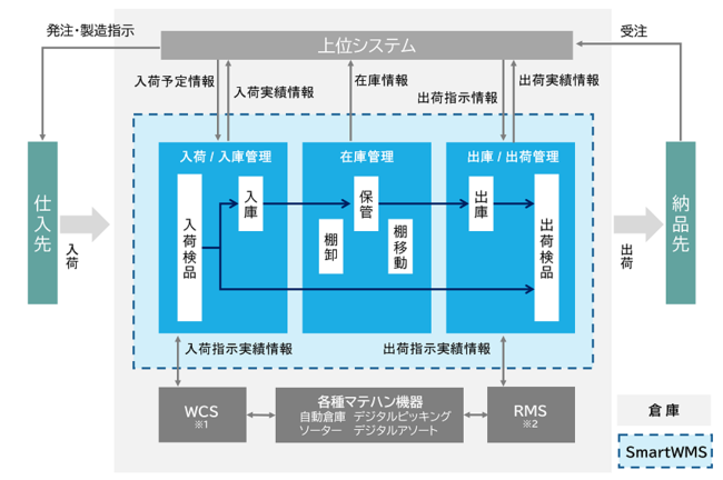 「入出庫管理」「在庫管理」「上位システムとのインターフェース」等、WMSの共通的な基本機能を有しており、幅広い倉庫に迅速な導入を可能とします。