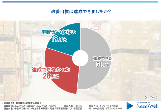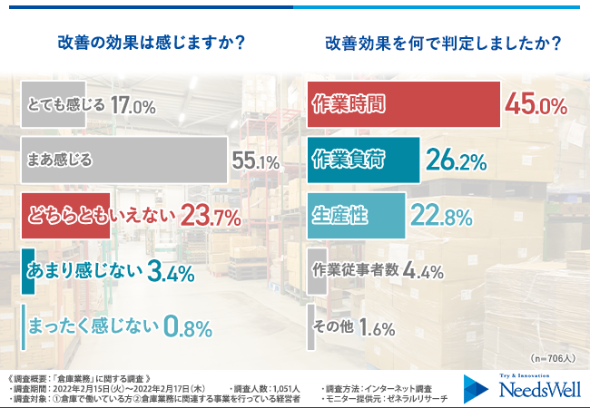 6割以上の方が自社の倉庫業務の改善に取り組んだことがあるようですが、実際にどれくらいの方が改善の効果を感じたのでしょうか?