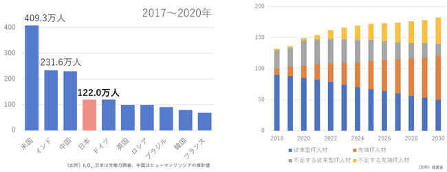 総務省の労働力調査(2020年)によれば、情報通信業の技術者は122万人います。国際労働機関(ILO)のデータと比べると米国(409万人)やインド(232万人)、中国(227万人)に次いで世界4位の多さです。それにも関わらず、IT人材不足と叫ばれているのは従来型IT人材がニーズにマッチしていないからと考えられます。