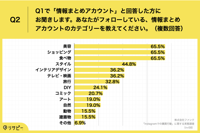 Q1で「情報まとめアカウント」と回答した方に、「Q2.あなたがフォローしている、情報まとめアカウントのカテゴリーを教えてください。(複数回答)」(n=58)と質問したところ、「美容」が65.5%、「ショッピング」が65.5%、「食べ物」が65.5%という回答となりました。