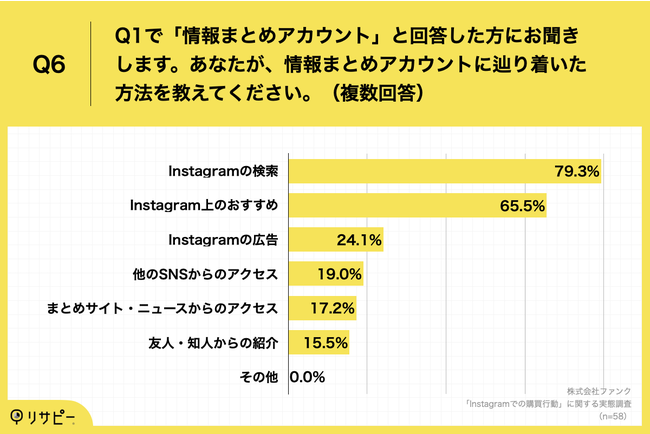 Q1で「情報まとめアカウント」と回答した方に、「Q6.あなたが、情報まとめアカウントに辿り着いた方法を教えてください。(複数回答)」(n=58)と質問したところ、「Instagramの検索」が79.3%、「Instagram上のおすすめ」が65.5%、「Instagramの広告」が24.1%という回答となりました。