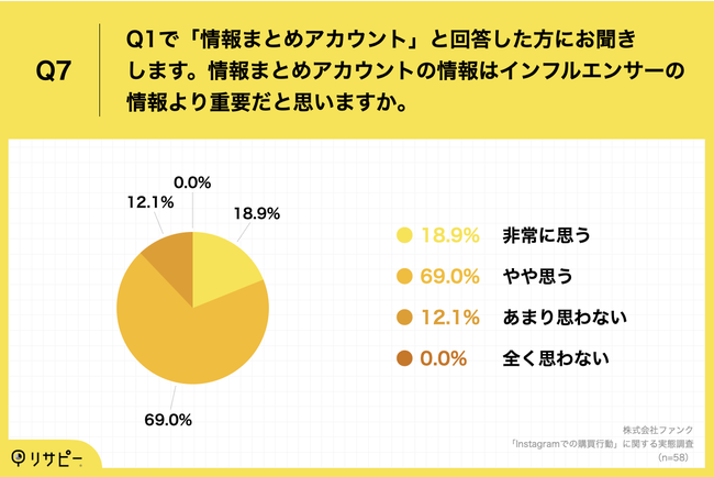 Q1で「情報まとめアカウント」と回答した方に、「Q7.情報まとめアカウントの情報はインフルエンサーの情報より重要だと思いますか。」(n=58)と質問したところ、「非常に思う」が18.9%、「やや思う」が69.0%という回答となりました。